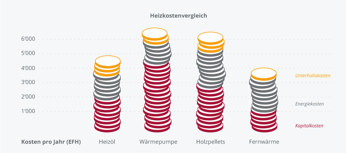 Fernwärme ist preiswert und nachhaltig. Im Preisvergleich zu Gas und Heizöl ist sie voll konkurrenzfähig und nicht zuletzt aufgrund der wegfallenden Nebenkosten wie Kaminfeger und Tankrevision äusserst interessant. Obenstehende Grafik vergleicht die jährlich zu erwartenden Kosten der verschiedenen Energiesysteme für Heizung und Warmwasser am Beispiel eines Einfamilienhauses.