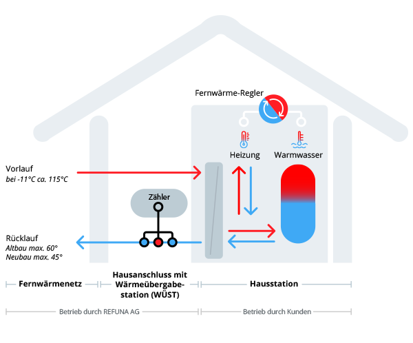 Nach der Fertigstellung des Hausanschlusses ersetzt die Hausstation nahtlos Ihre bestehende Anlage. Zum Schluss schalten Sie Ihre neue Heizung ein und geniessen regional produzierte Wärme.